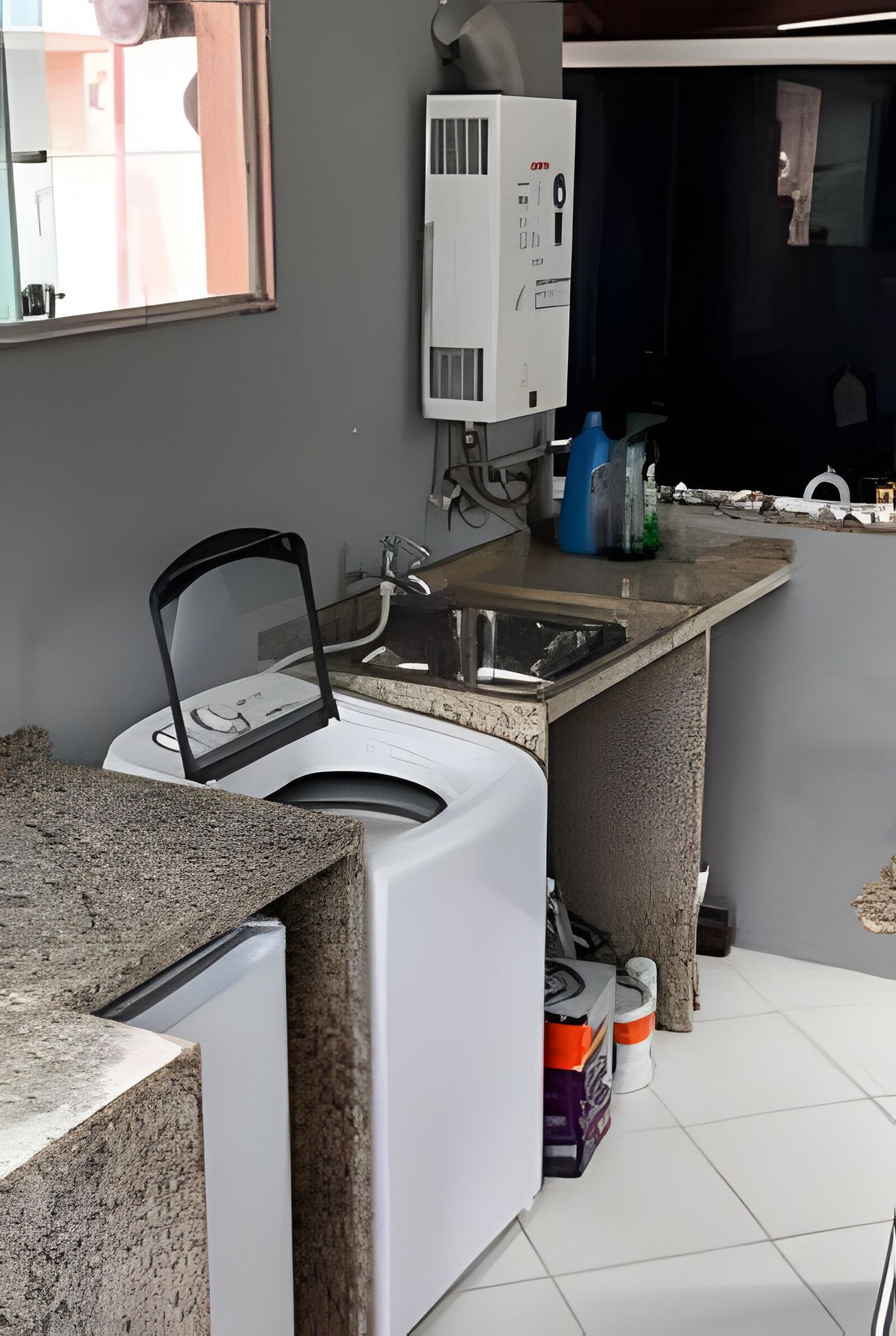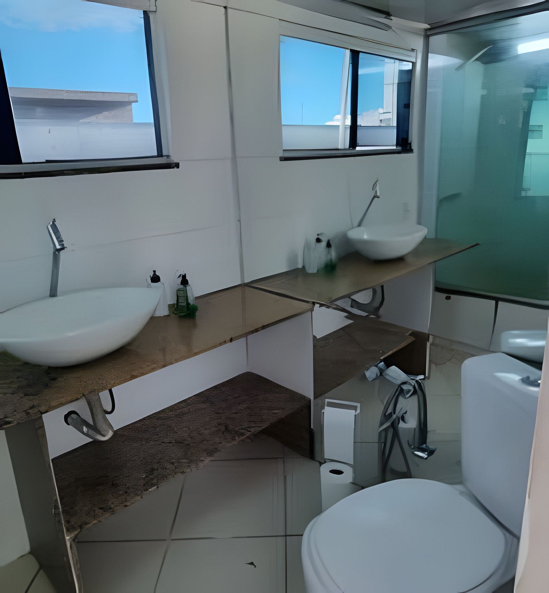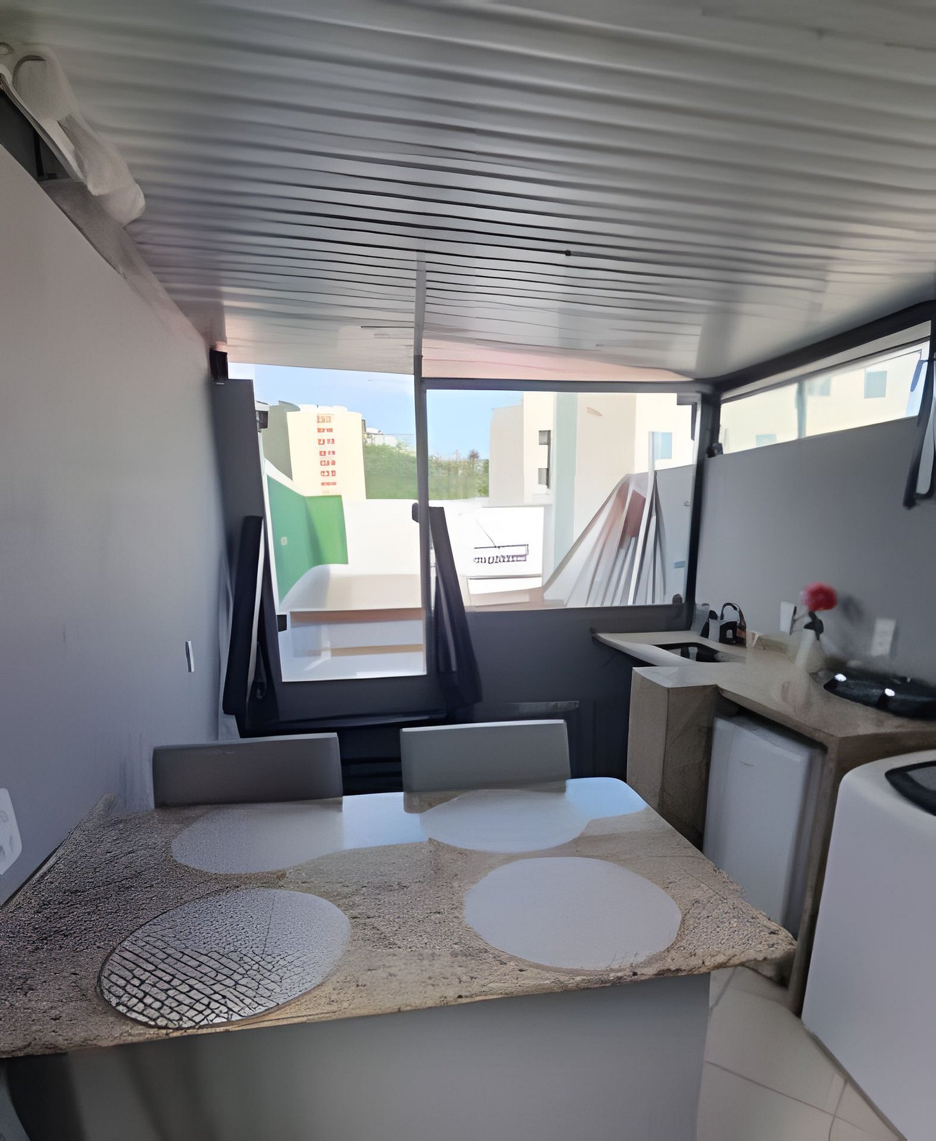 É uma cobertura e no térreo tem a sala com sofá cama, a cozinha com bancada e um quarto com suíte que tem ar e ventilador de teto. No segundo andar temos 2 quartos com cama de casal e ar condicionado, um banheiro social, a lavanderia anexo a uma cozinha com fogão elétrico e frigobar e uma área externa com um deck com chuveiro e um espaço ao ar livre. As pessoas costumam tomar sol com cadeira de praia no deck e se refrescar no chuveiro.